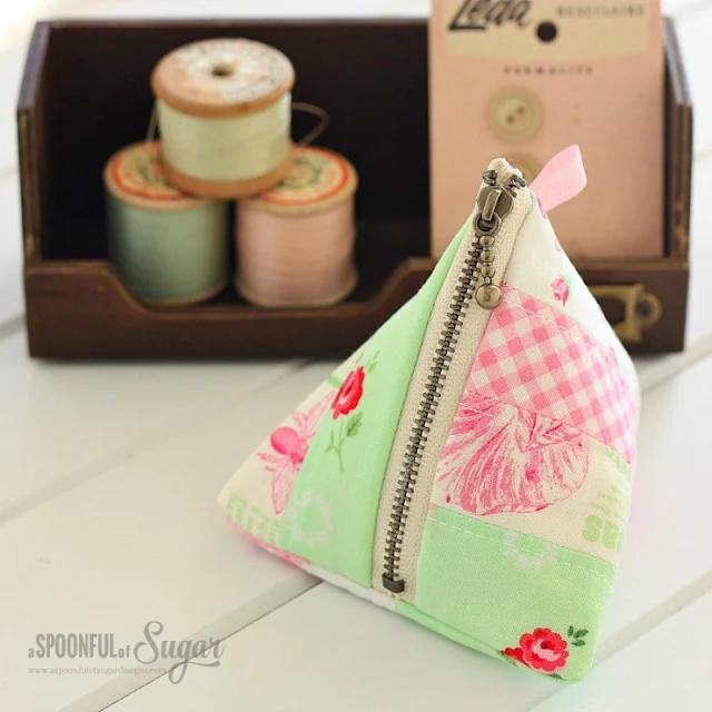 Essas pequenas bolsas triangulares são divertidas de fazer e são perfeitas como bolsas de moedas pequenas, para guardar itens essenciais de maquiagem ou alguns suprimentos de costura. Fabricadas com quatro tiras de tecido, são rapidamente montadas e dão ótimos presentes. A parte divertida é escolher quatro tecidos de coordenação.